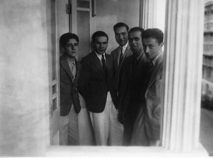 کيواني (نفر اوّل، کنار پنجره) و صادق هدايت (نفر اوّل، کنار ستون) در