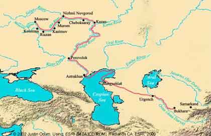 قازان (1552) و حاجي طرخان (1556) بود. بدينسان، دولت نوخاسته روسيه با ايران هممرز شد و راه تجاري ولگا- بحر خزر مورد توجه آن کانونهاي تجاري- سياسي اروپاي غربي قرار گرفت که سلطه انحصاري پرتغال بر راههاي دريايي تجارت با شرق مانع از تحرک ايشان بود. همپاي اين تحول، سفر سالهاي 1553- 1554 و 1555- 1556